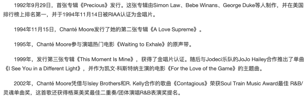 另外一位是来自Chante Moore,67年生人,多次被格莱美提名,种族自带的音乐天赋,可以轻松飚到B6海豚音