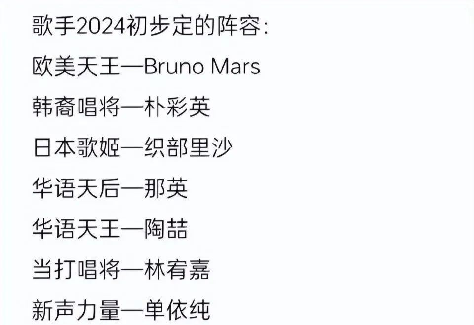 比如,官宣后的网传名单,主打一个国际化巨星 超级实力唱将,从火星哥到rose,从那英到单依纯。