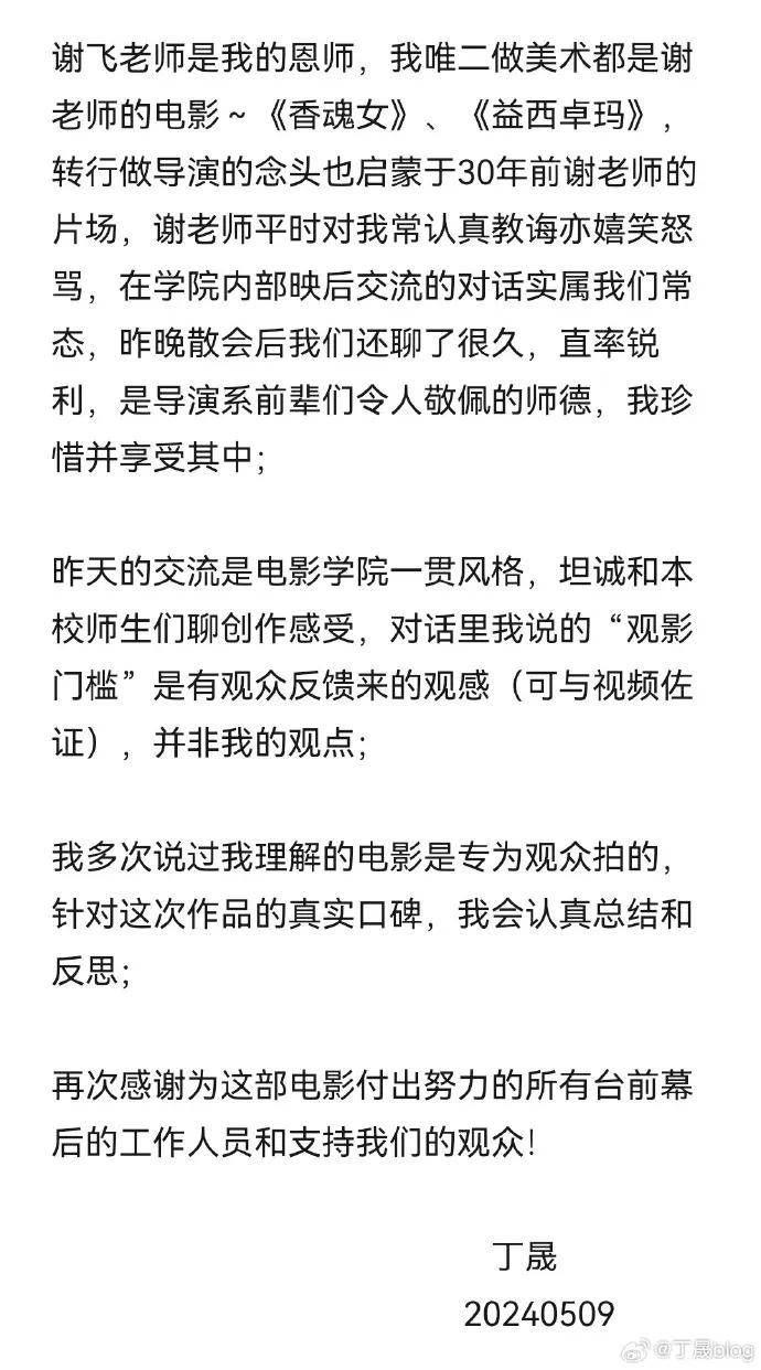 丁晟也发微博,指出谢飞导演是自己恩师,直率锐利,令人净重。谈到“观影有门槛”是有观众反馈来的观感。