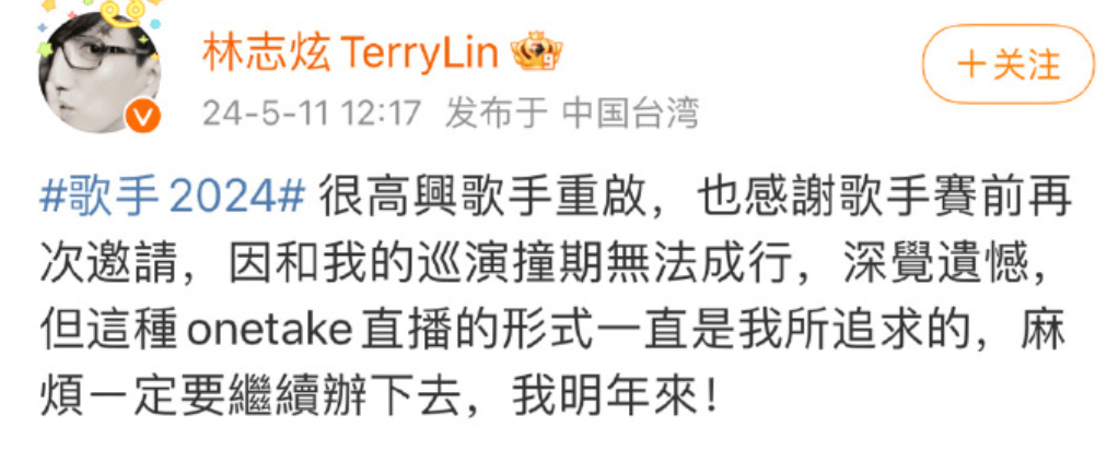 还有网友艾特林志炫,林志炫还特意发文解释,自己收到了节目组的要求,但是跟自己的档期撞了,他会明年再战!