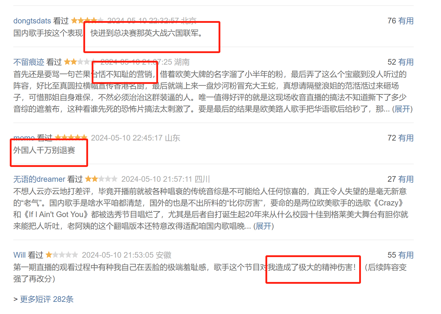 可口碑方面却多少有点儿翻车。豆瓣首页随机显示的五条热评,有三条都是一星、二星的差评,全方位吐槽节目,比如有观众洋洋洒洒写了几百字,骂芒果台营销无底线,用欧美大牌的名字溜粉半年,结果阵容并不能让他满意。还有打一星的观众指控“这个节目对我造成极大精神伤害”,而另外两个打高分的观众其实也是明褒暗贬,讽刺“国内歌手按这个表现,快进到总决赛那英大战六国联军”,以及“外国人千万别退赛”。