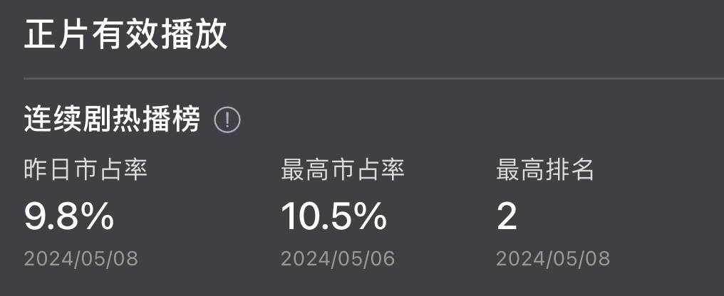 但市场并没有给出太好的反馈。《微暗之火》正片有效播放的最高市场占有率仅10.5%,站内热度峰值只有8000出头;在收视底盘较大的央八播出,但其CVB收视率一度低于1%。