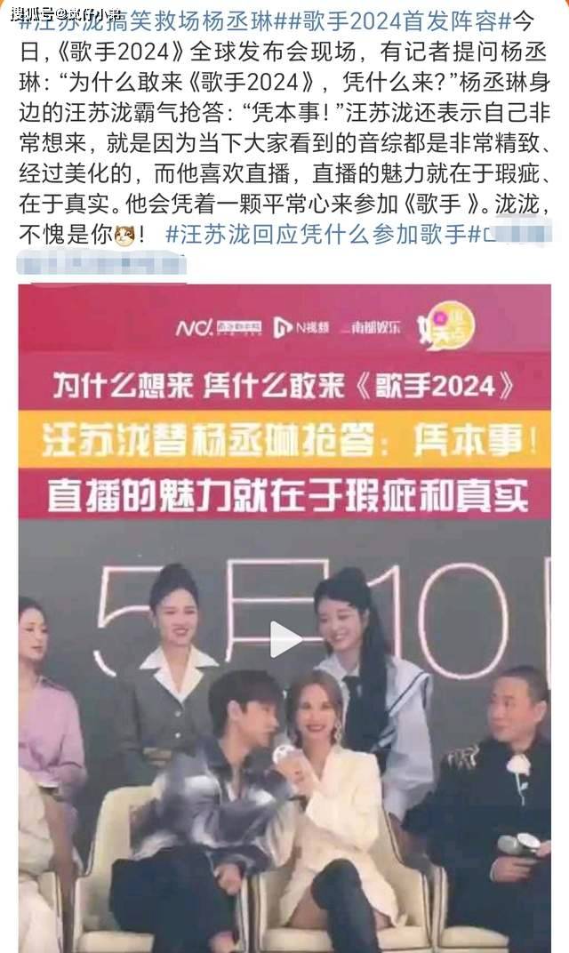 不仅如此,在此次发布会中,诸多媒体也纷纷对各位歌手提出问题,其中,最为犀利的一个问题就是:为什么敢来《歌手2024》,凭什么来?当中关注度最高的就是杨丞琳和汪苏泷的回答了。