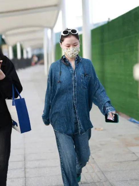金靖穿着一身宽松牛仔衣,戴着口罩和墨镜,但看得出脸部浮肿,孕肚明显。