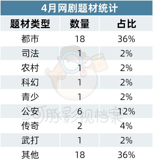 在题材方面,4月份现实题材依旧占比最高,以主流地位占据着60%的高比例。在细分题材方面,共计都市题材18部,司法题材1部,农村题材1部,科幻题材1部,青少题材1部,公安题材6部,传奇题材2部,武打题材1部,其他题材18部。