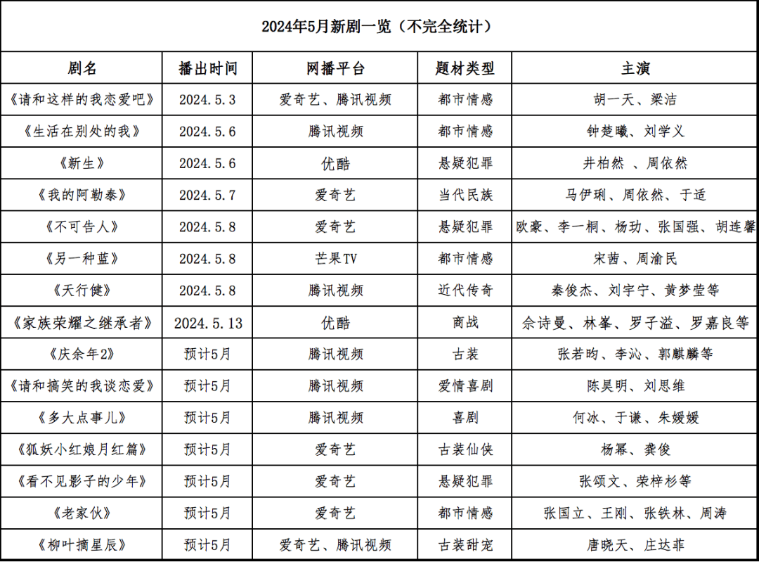 从已播出或确定上线日期的剧集来看,5月上半场的这一波新剧整体距离爆款还差点儿意思。题材方面,既有都市情感、悬疑犯罪等常规类型,也有久违的家族商战,还有当代民族此类较新的细分领域。