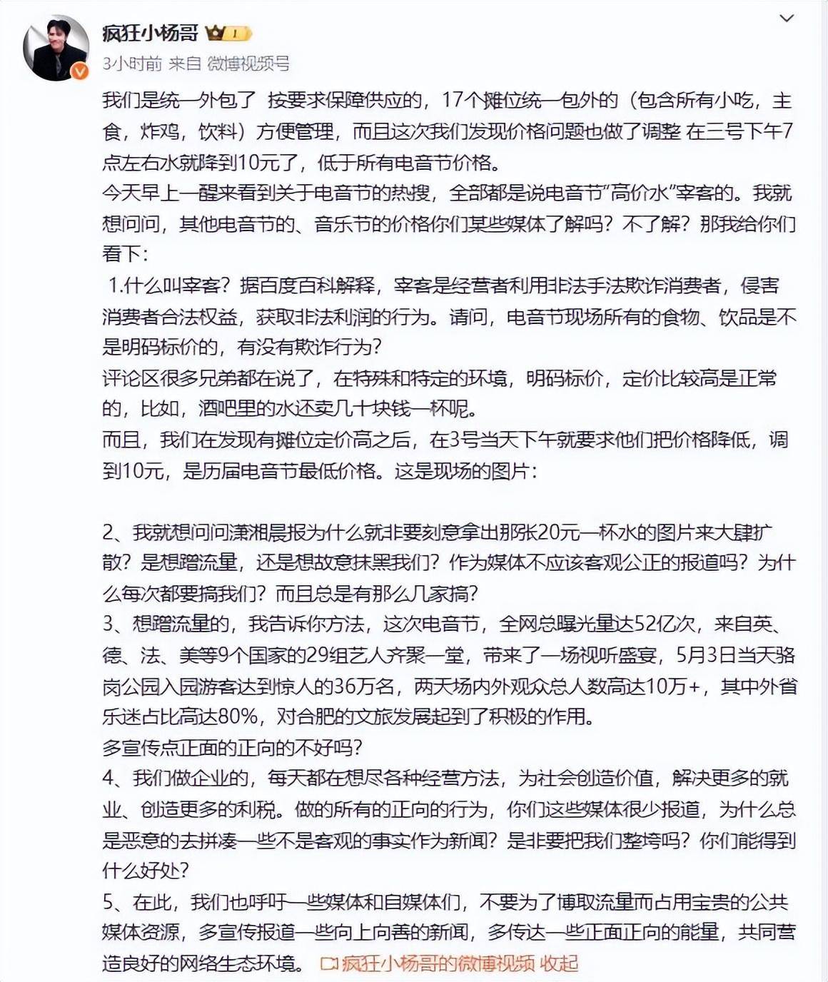 对此,小杨哥也迅速在网络上发布了一则视频进行回应,他表示电音节是一类特殊活动,现场的食品和饮料的价格也是符合业内标准的,不存在宰客的现象。