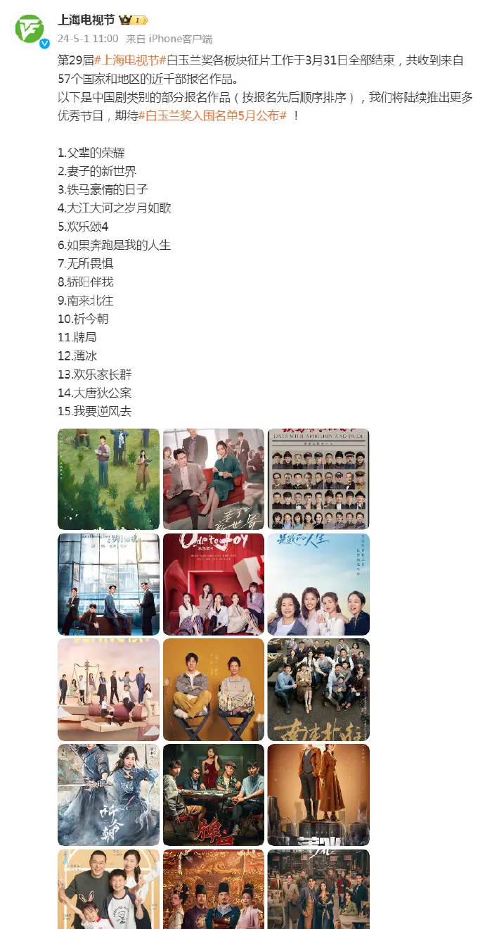 原标题:白玉兰奖中国剧类别报名作品公布 电视剧《繁花》也在册