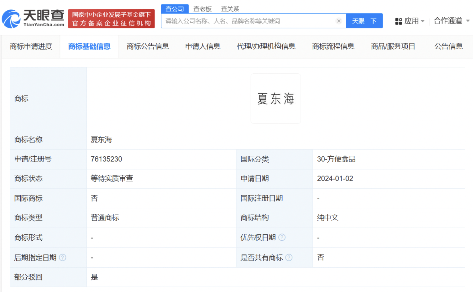 搜狐娱乐讯 今日,高亚麟被曝孕期出轨,引发舆论关注。有网友调侃,塌房的风还是吹到了家有儿女。据悉,高亚麟因在电视剧家有儿女中扮演夏东海被观众熟知。天眼查App显示,“夏东海”曾于2011年被某海产品公司申请注册商标,国际分类为食品,该商标于2012年注册成功,不过,2023年,该商标因未续展注销,现已处于无效状态。另外,今年1月,有文化公司申请注册方便食品类“夏东海”商标,目前该商标状态为等待实质审查。值得一提的是,家有儿女电视剧角色刘梅、刘星、夏雨、夏雪,以及刘星的台词“夏冰雹”都曾被注册为商标,其中部分已注册成功。