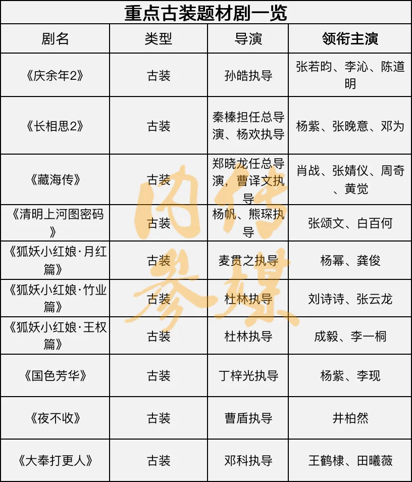 据不完全统计,目前待播的重点古装剧达10部以上,包括《庆余年2》《长相思2》《藏海传》《清明上河图密码》《狐妖小红娘·月红篇》《狐妖小红娘·竹业篇》《狐妖小红娘·王权篇》《国色芳华》《夜不收》《大奉打更人》。