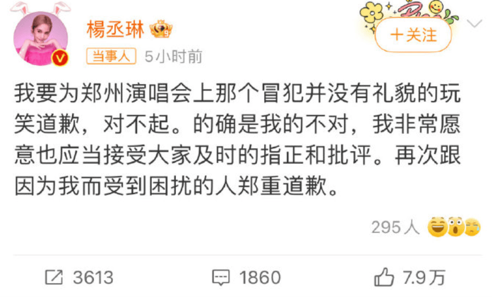 之后,杨丞琳也在第一时间进行道歉。