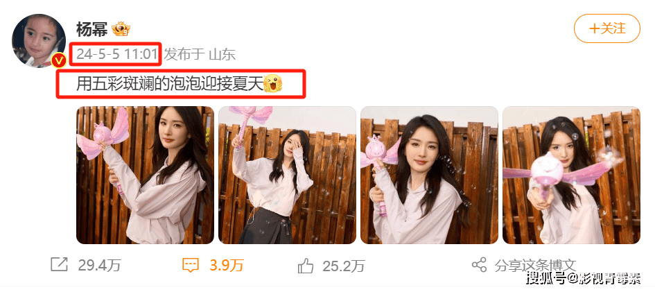 5月5日当天,杨幂也发微博说:“用五彩斑斓的泡泡迎接夏天。”杨幂还晒了4张照片,显得心情非常好,没有受电影撤档的影响。难道《没有一顿火锅解决不了的事》撤档了,杨幂很开心吗?