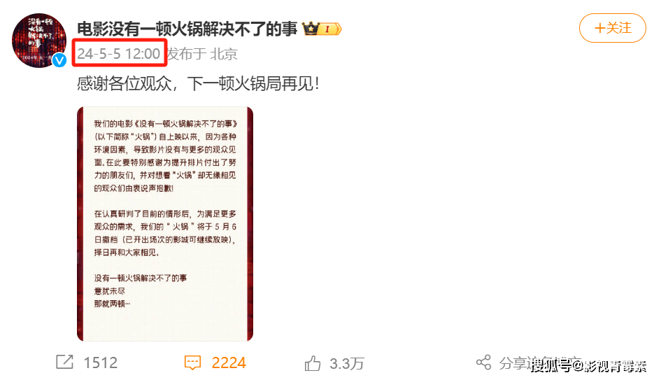 非著名娱评人吴清功指出:5月5日中午12点,电影官微发文宣布撤档,因为排片太低,票房太低。6分钟之后,导演丁晟发微博说:“谢谢大家,意犹未尽,择日再聚。”