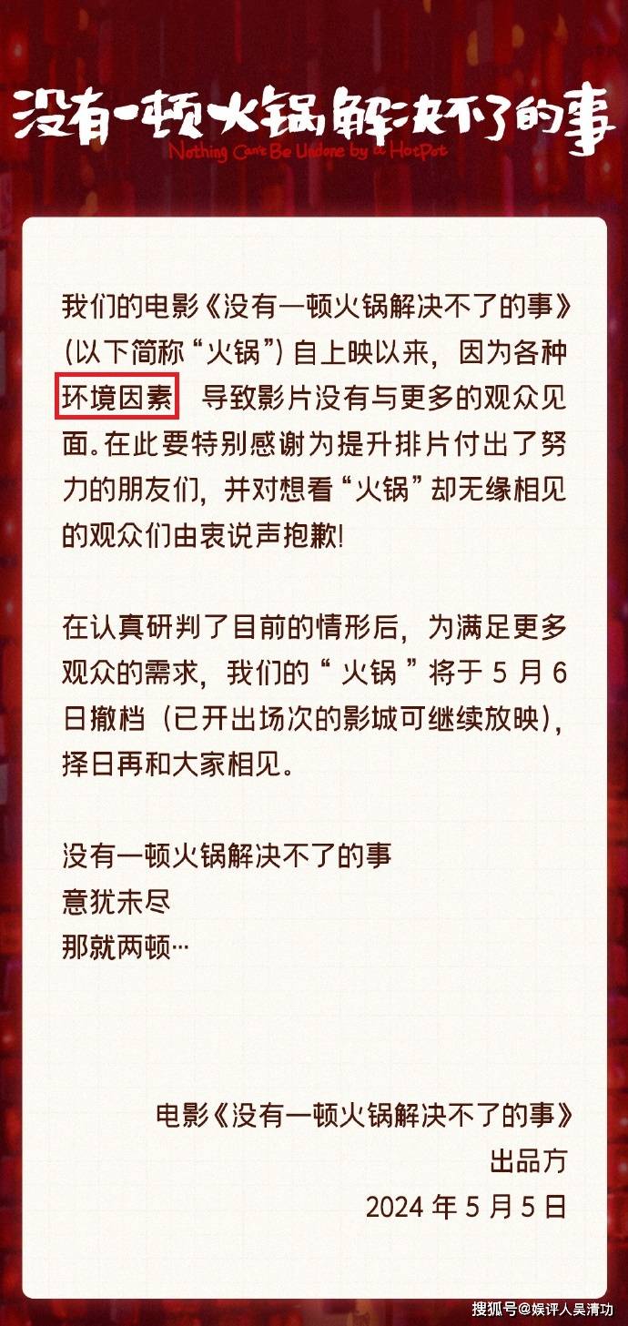 丁晟执导,杨幂和于谦主演的电影《没有一顿火锅解决不了的事》,于5月1日上映,于5月5日中午宣布撤档。片方解释原因说:“因为各种环境因素,导致影片没有与更多的观众见面。”什么环境因素?没有疫情,没有过于强大的竞争对手,没有不正当竞争,到底是什么原因?