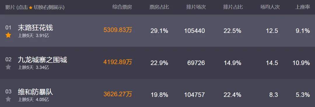 五天票房破了3.9亿,而且在上座率,场均人次这些重要维度上,后者实现了领先,《维和防暴队》被《末路狂花钱》黑马逆袭就在眼前。