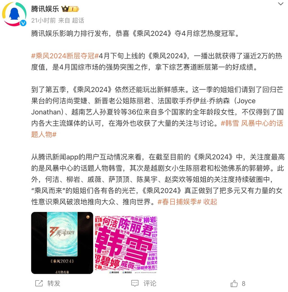 结果也很明显,节目又火了,但令人没想到的是,在这三十多位姐姐们中,话题度最高的居然是韩雪。