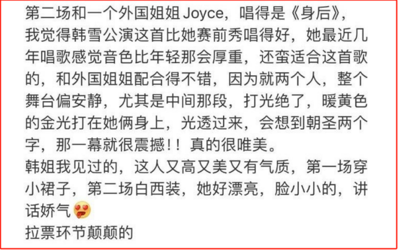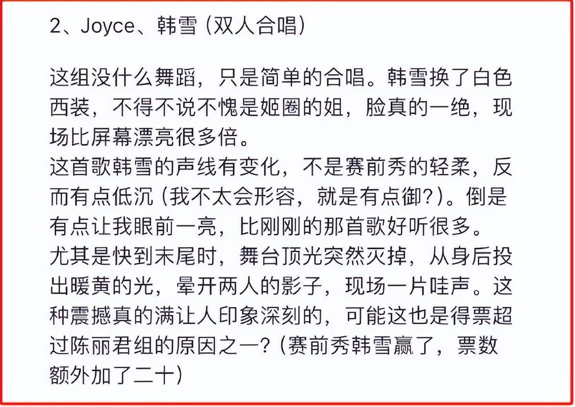 例如二公小考阶段,每到一个团队下场表演,韩雪就做到同步介绍其他姐姐。称尚雯婕与蔡诗芸是两大唱将,特别是对尚雯婕,说她是很棒的歌手。我是看到这一幕时,突然想起尚雯婕是毕业于复旦大学法语系的高材生,就很期待Joyce与尚雯婕来一次法语炸场。