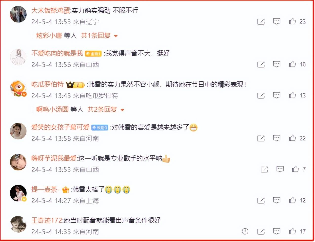 节目播出当天,“韩雪vocal”的话题词直接冲上热搜,热度居高不下,名副其实的“话题女王”。