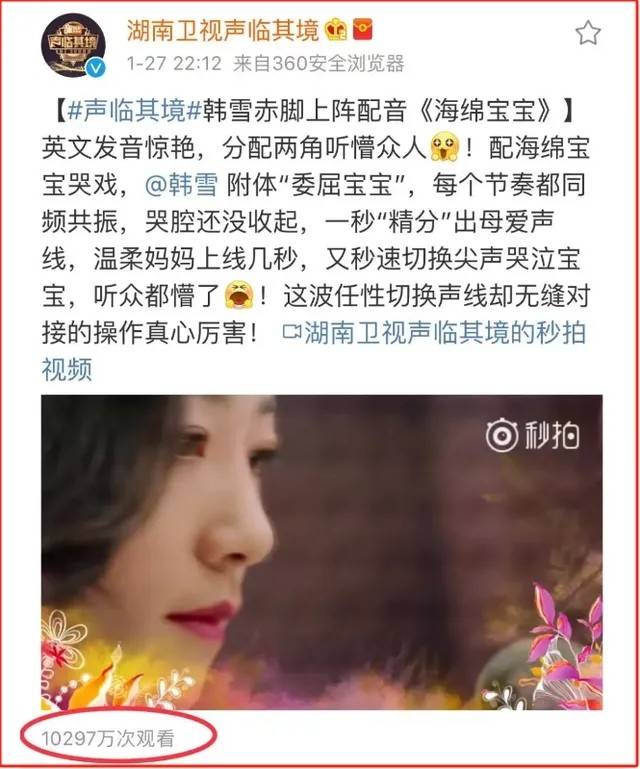 一段给《海绵宝宝》动画的配音,从英文发音到配音能力,两个角色转换自如,韩雪得到了一致肯定。这段两分钟的配音,当时在微博上有一亿的播放量。