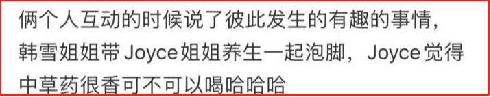 还有网友爆料称,两人互动环节时,说了彼此发生的有趣的事情。韩雪带Joyce一起泡脚,Joyce觉得中草药很香,还想来上一口,也是被可爱到了。