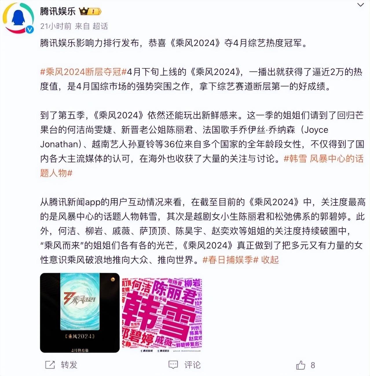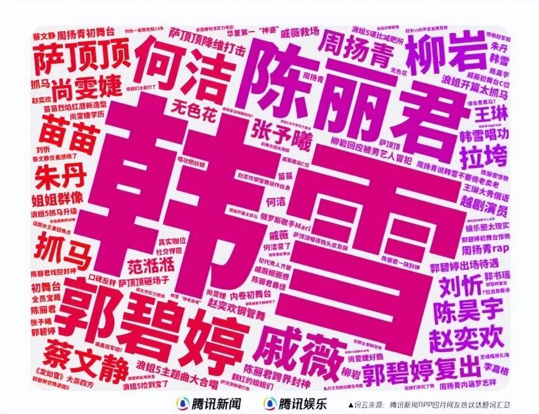 近日,腾讯娱乐发布影响力排行,其数据表明,《浪姐5》一播出,就获得了近2万的热度值,成功拿下4月综艺热度冠军的好成绩。而在来自多个国家的36位姐姐中,关注度最高的是韩雪,其次是陈丽君和郭碧婷。