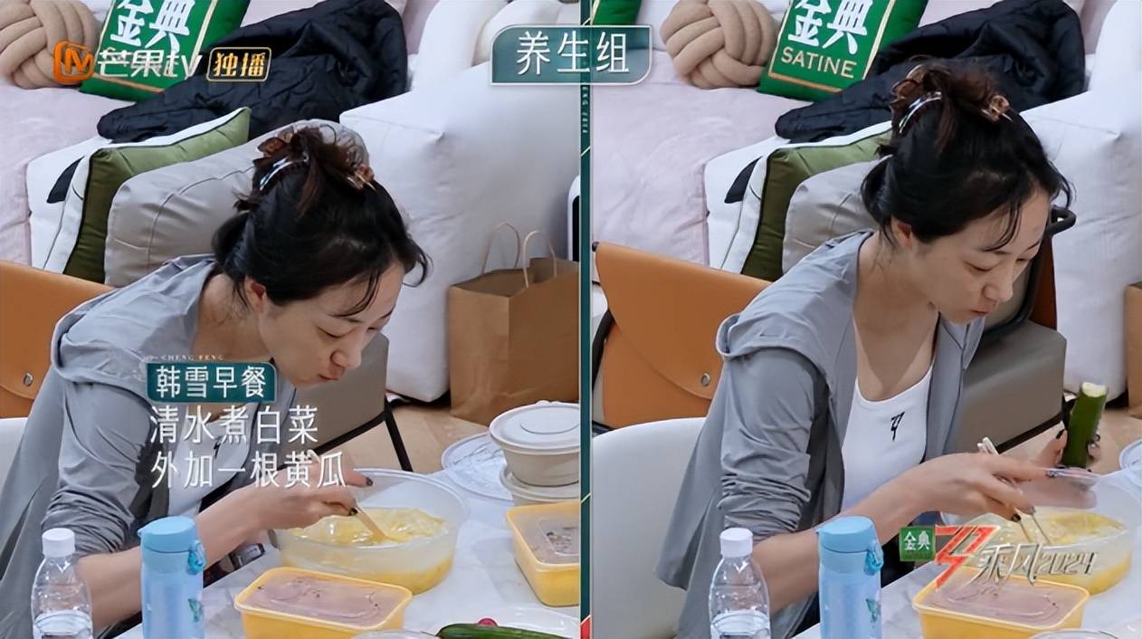 从早餐就可以看出,两人都是秉着轻饮食的理念。Joyce的早餐中,混搭了酸奶、枸杞、水果、坚果。而韩雪就更简单了,一碗清水煮白菜,再加一根黄瓜。