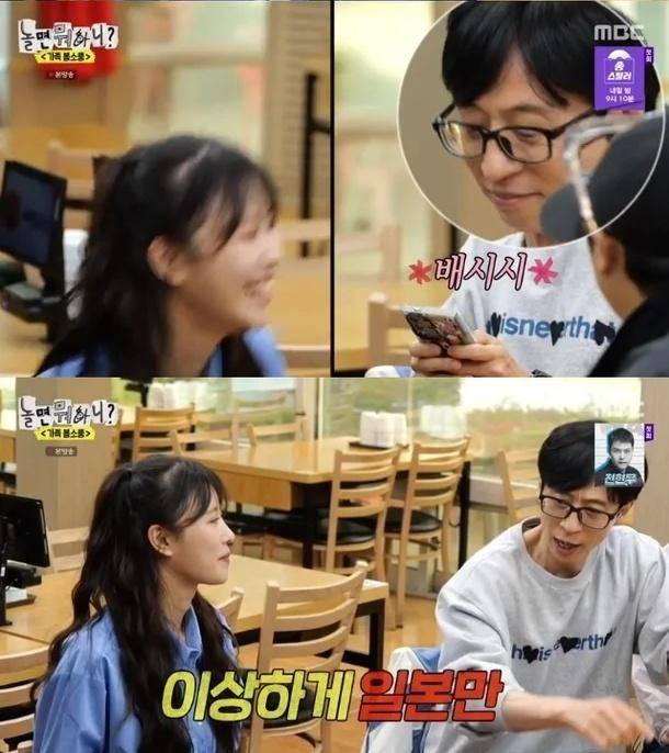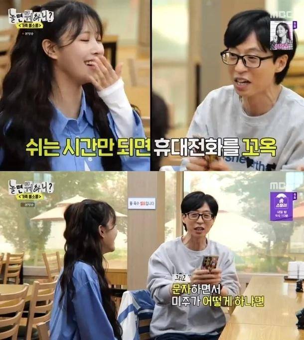 刘在石爆料说,美珠开始约会,我在某种程度上知道了,她并没有正式说,我有男朋友,此前她是一个很少看手机的人,在过去的三四个月里,只要录音中断,她就开始使用她的手机,当她给他发短信时,她笑得很厉害。