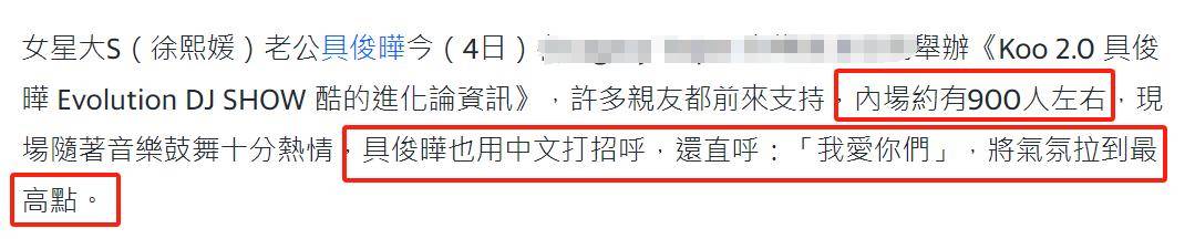 据台媒报道,具俊晔这次的演出到场的观众才900人左右,这其中还有不少是看着大小S面子去捧场的。