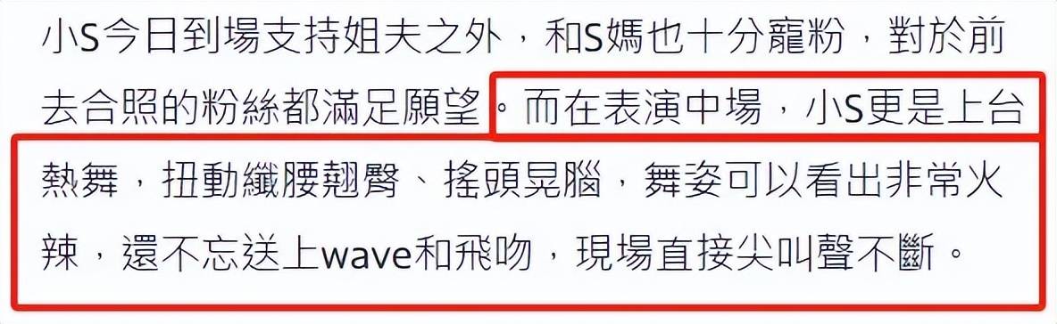 姐姐不在,小S担起重任,为了开场炒热气氛,亲自上台和姐夫互动,大跳热舞,现场尖叫不断。