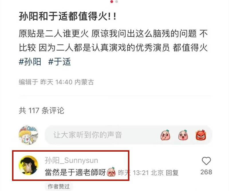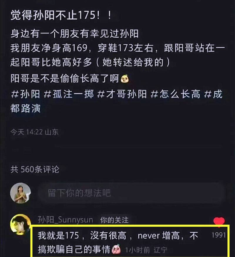 粉丝说觉得他身高不止175,他随即现身评论区回应“就是175,没有很高”;有网友发帖讨论孙阳和于适谁更火,他表示“当然是于适老师”。
