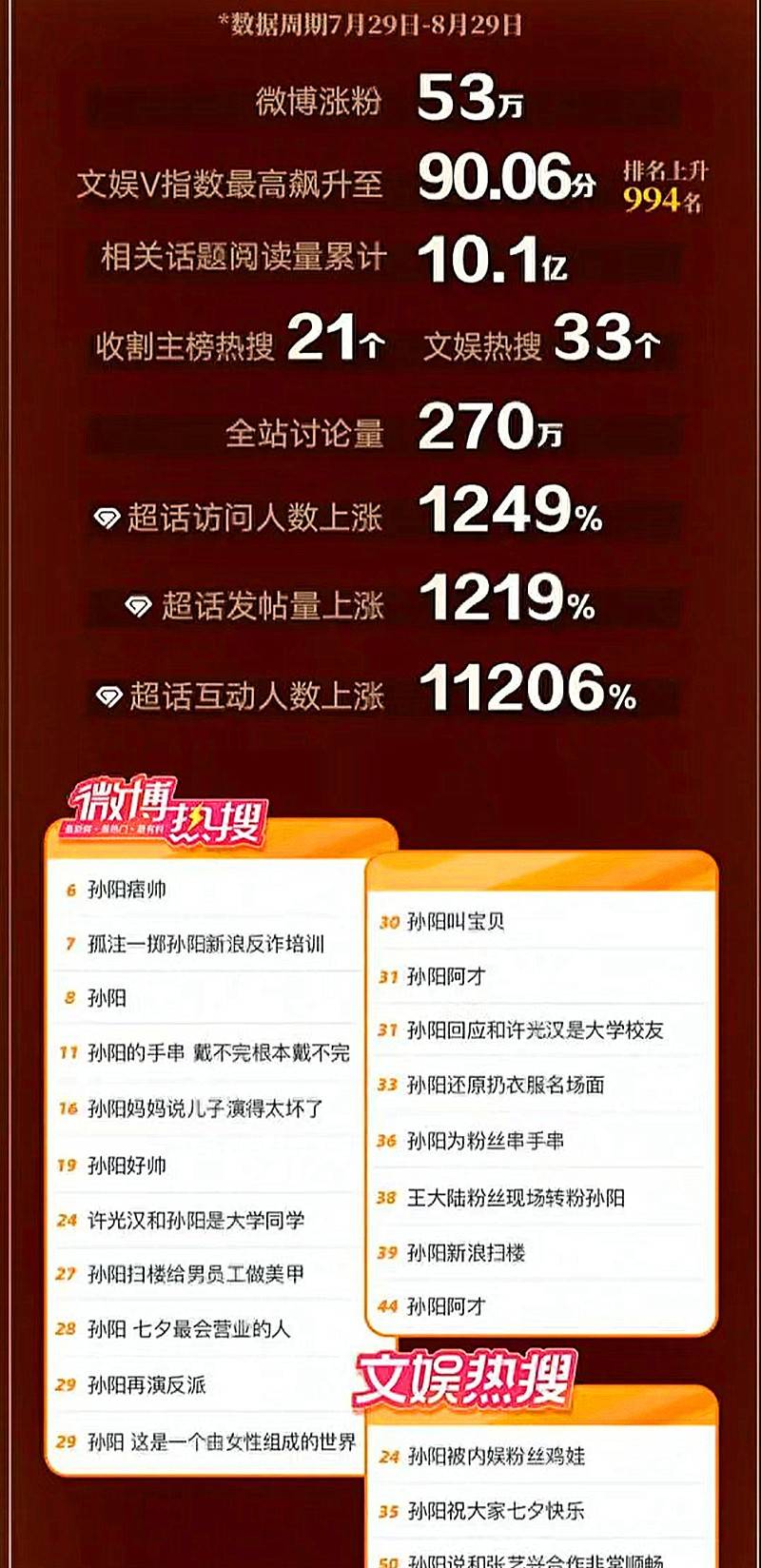一个月之内,他社交平台涨粉53万,热搜话题累计达50余个,相关阅读量超10亿,文娱V指数最高时飙升至90.06分。