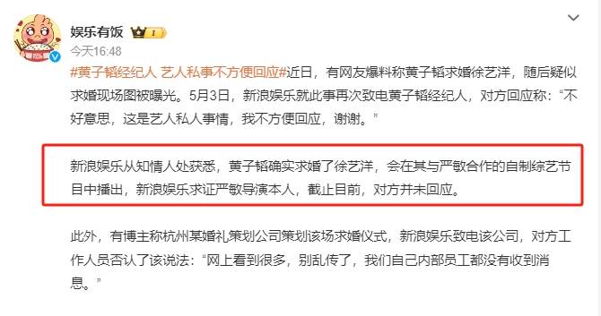 在求证黄子韬经纪人的同时,又一知情人出来回应,爆料黄子韬确实有向徐艺洋求婚,而这些内容将在黄子韬与严敏合作的新综艺中播出。而根据黄子韬粉丝的说法,黄子韬确实会推出一档恋爱类的自制综艺,徐艺洋也确实参与了录制,大大增加了在节目中求婚的可信度。