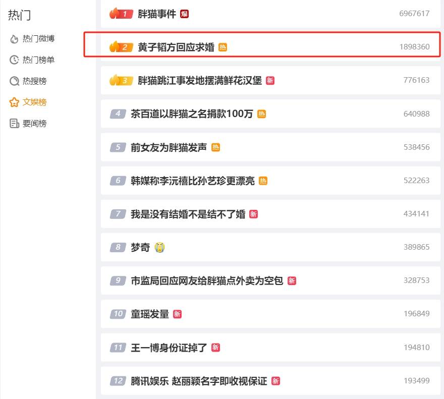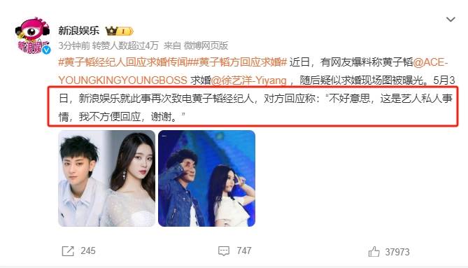 5月3日,距离黄子韬被曝求婚已经过去了近一个星期,本来外界对此已经淡忘,谁知黄子韬的经纪人在这个关头又跳出来回应了此事,面对记者的求证,黄子韬经纪人直言“不好意思,这是艺人私人事情,我不方便回应,谢谢”。回应了又好像什么都没回应,但是又将此事推上了热搜,掀起了新一轮讨论。