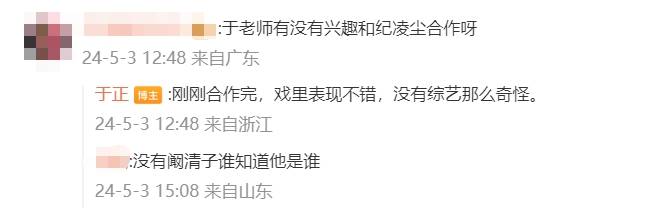 搜狐娱乐讯 3日,有网友在于正动态下留言问道:“于老师有没有兴趣和纪凌尘合作呀?”对此,于正回复道:“刚刚合作完,戏里表现不错,没有综艺那么奇怪。”
