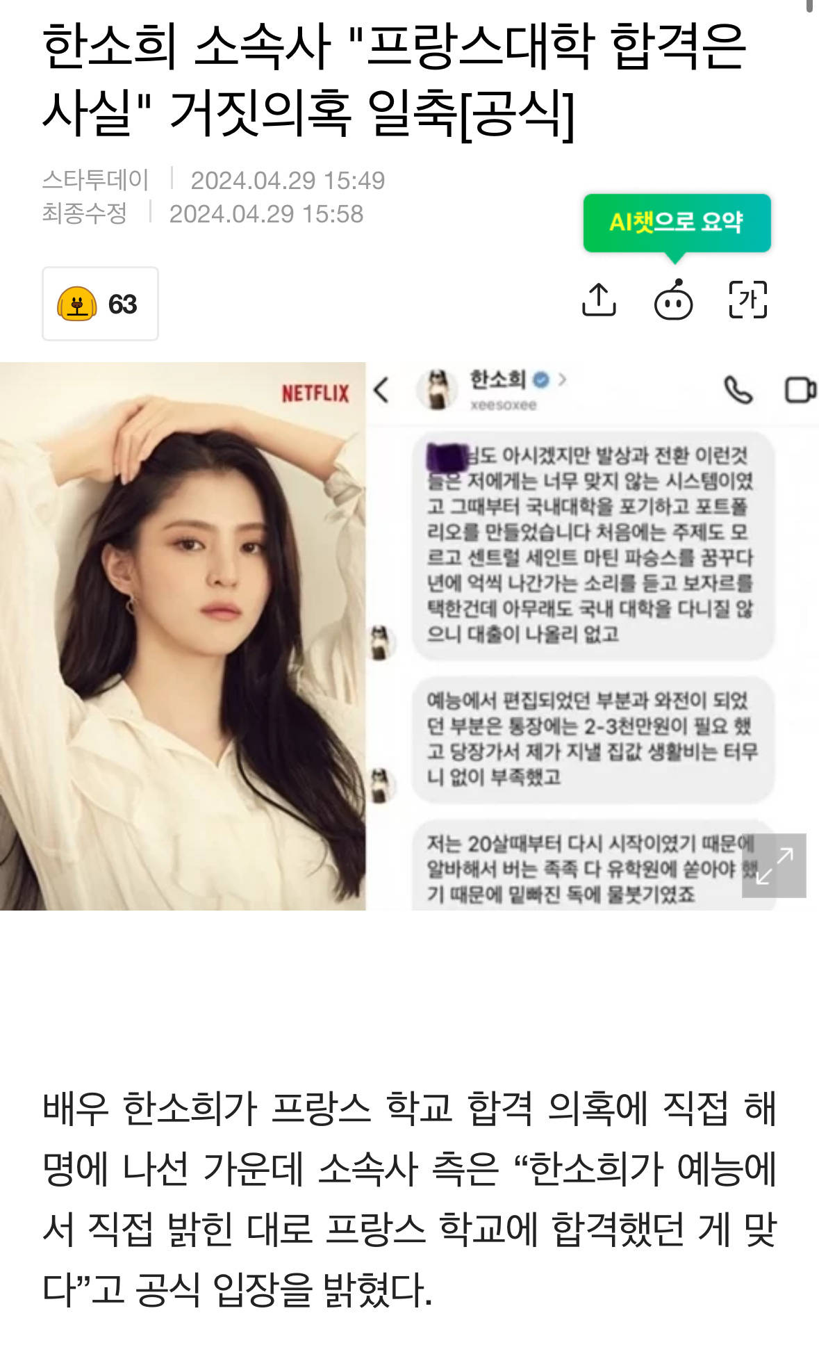 经纪公司方面对韩媒表示:“具体事项是个人隐私所以不能告诉大家,但韩素希演员在节目中直接说的内容都是事实,她确实是考上了法国学校。”断然否认了“撒谎”的质疑。