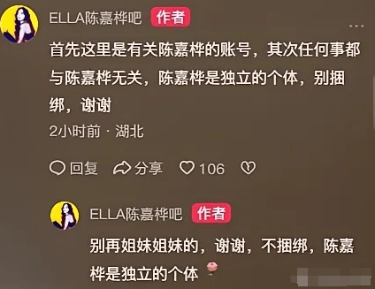 对于网上的言论,Ella方回应说:其他事和Ella无关,Ella是一个独立的个体,不要胡乱捆绑。