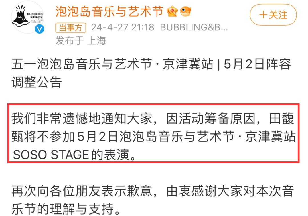 因为就在前几日,Ella的队友Hebe田馥甄刚刚因为立场问题被全网举报,失去了参加泡泡音乐节的资格。