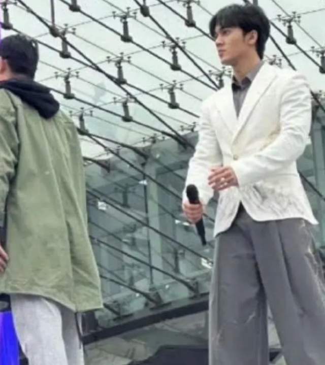 陈牧驰身穿一身白色修身西服,下面搭配A版阔腿裤,这种穿搭很显身材,倒很符合陈牧驰的穿衣风格。