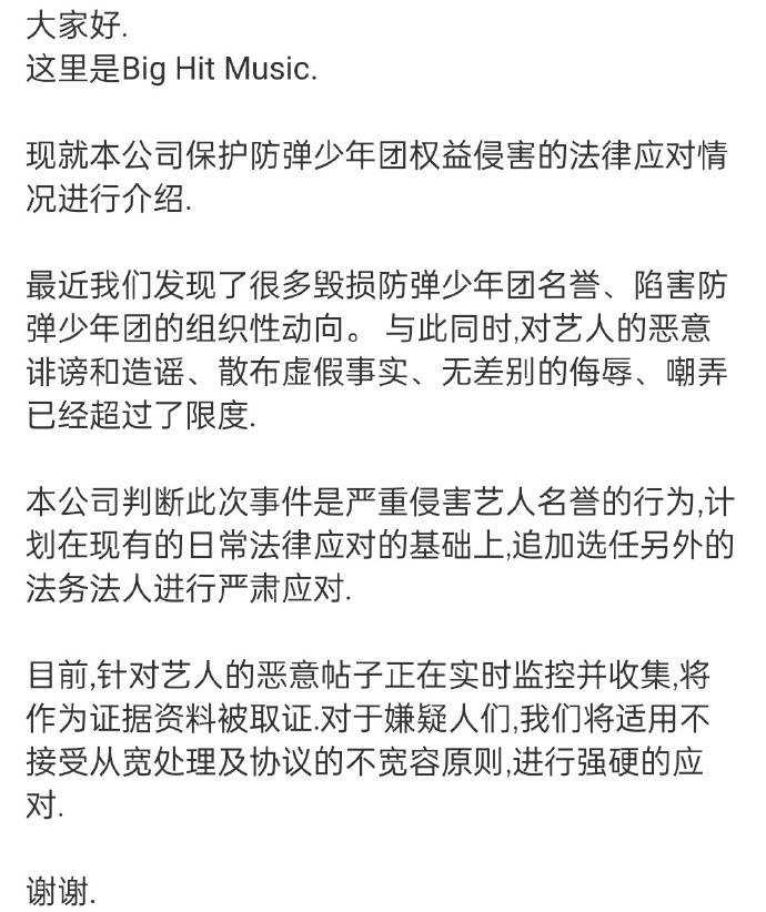 原标题:防弹少年团发布官方维权公告 称此事严重侵害艺人名誉