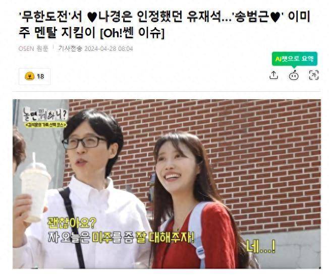 韩国知名艺人刘在石,安慰了传出恋爱传闻的后辈李美珠。