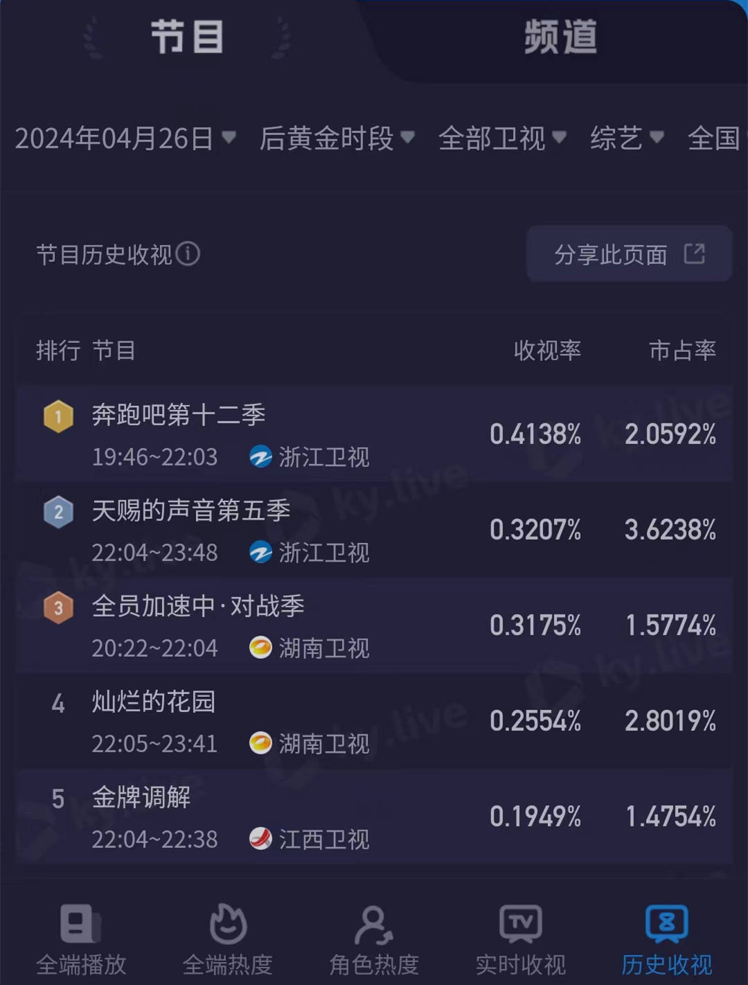 4月26日夜间,后黄金时段,综艺节目《天赐的声音》第五季的首期内容,在浙江卫视播出。根据酷云实时在次日开出的卫视后黄金时段的收视率数据来看,《天赐的声音》第五季的首期内容,实现了卫视同时段领跑。同日,同时段,在湖南卫视播出的《灿烂的花园》这档首播综艺,未能在收视数据上打败《天赐的声音5》。