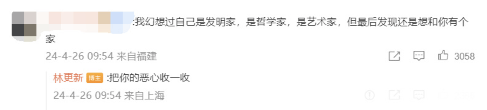 原标题:林更新开玩笑回复粉丝土味情话:把你的恶心收一收