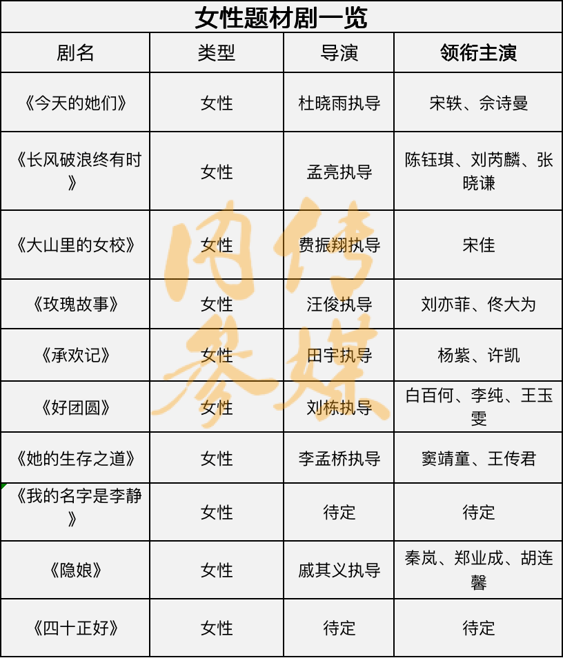 据不完全统计,目前待播的女性题材剧达10部以上,包括《今天的她们》《长风破浪终有时》《大山里的女校》《玫瑰故事》《承欢记》《好团圆》《她的生存之道》《我的名字是李静》《隐娘》《四十正好》。