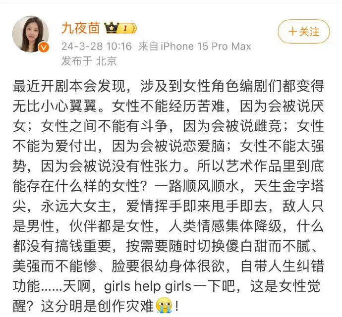 搜狐娱乐讯 3月28日,作家九夜茴发文谈剧本创作,她表示最近的剧本设计女性角色编剧们都变得很小心,并列举了创作时女性之间不能出现的关系。九夜茴提问到“所以艺术作品里到底存在什么样的女性?”,随后写道:“这分明是创作灾难”。