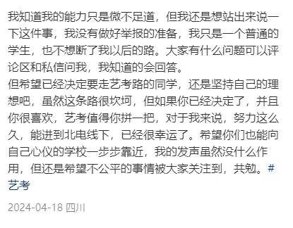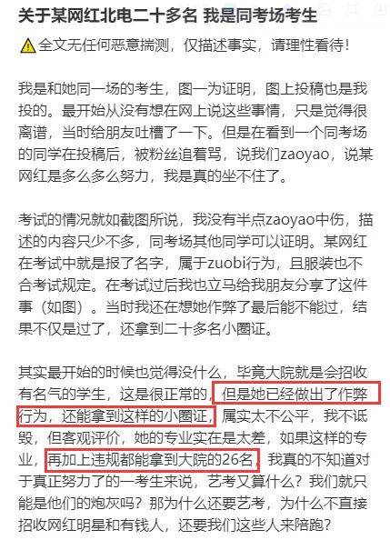如今,这名爆料者也揭露了李闽轩的作弊细节,她称李闽轩艺考时明明已经违规,却能拿到26名的好成绩,认定这次考试明显有黑幕。