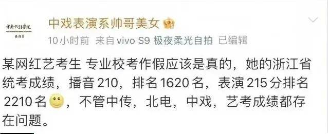 网友还揭发李闽轩省统考成绩排名2000多名,播音210,排名1620,表演215分排名2210名,不管中传、北电、中戏,她的艺考成绩都存在问题!