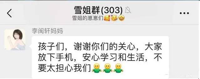 该事件持续发酵,李闽轩本人也没有回应,李闽轩的妈妈在群里说“大家放下手机,安心学习和生活,不要太担心我们”,等于说了这样模棱两可的话。