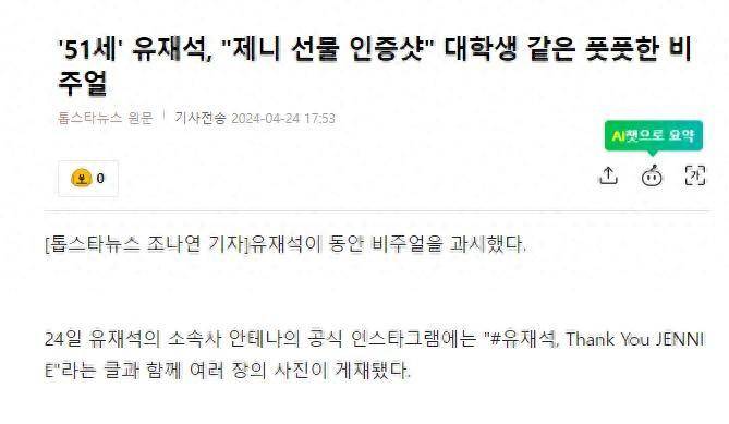 24日,有韩国媒体报道,刘在石经纪公司Antenna官方Instagram上发布了多张照片,并留言“刘在石,谢谢Jennie”。