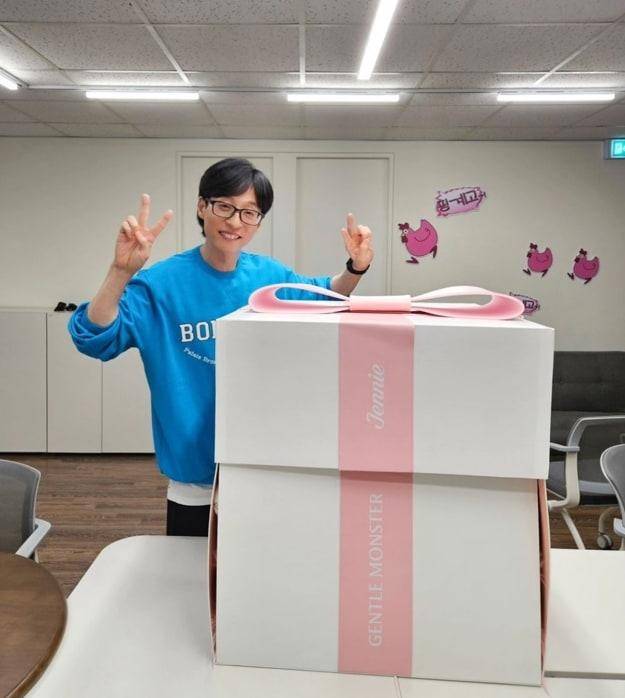 在公开的照片中,刘在石在Jennie送来的绑着丝带的大盒子前,一边对着镜头微笑,一边比出V字形。刘在石以蓝色运动衫完成了清爽的休闲时尚造型,以忘记年龄的青春形象吸引了大家的目光。