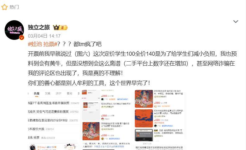 然而,蛙池乐队面向乐迷的“让利”却让黄牛把价格炒上天。在门票已经售罄的热点城市,百元票价已然翻了两倍甚至三倍。由于闲鱼、摩天轮等正规二级票务平台的余量有限,更多的乐迷转而在社交媒体上求票,不乏乐迷遭遇了一批收款以后拉黑删除一条龙的“电诈服务”。